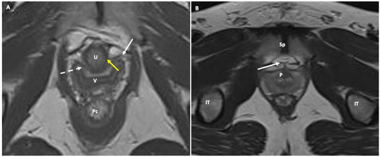 Figure 4. Axial T2-weighted MR images of levator ani hiatus showing the periurethral (white arrow), the paraurthral (yellow arrow), and pubourethral (white dotted line) female ligaments (A). Corresponding similar structures can occasionally be seen in young males (B) in the retropubic space just ventral to the prostate (arrow). U: urethra; V: vagina; Pc: pubococcygeal muscle; Sp: symphysis pubis; IT: ischial tuberosity; P: prostate. - Vaginal canal: From internal to external, the vaginal canal shows a high-signal intensity (due to mucous or secretions) surrounded by three layers with differing signal intensities: a low-signal-intensity inner layer corresponding to squamous keratinized epithelium and lamina propria; an intermediate-signal-intensity middle layer representing the muscular wall; and a low-signal-intensity outer layer representing loose connective tissue with its vascular supply.