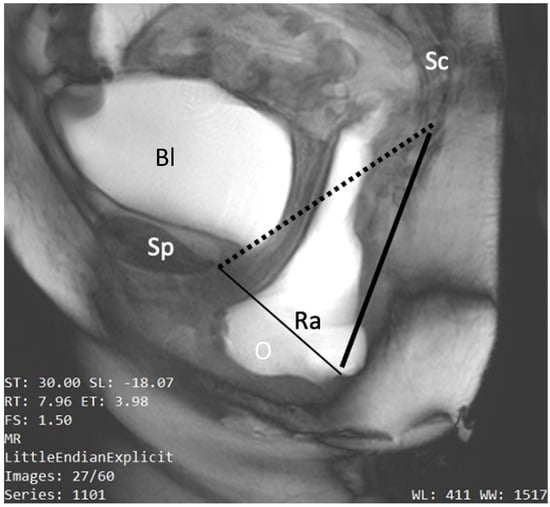 Dynamic midsagittal MR image taken during evacuation for quantification of pelvic organ descent by the HMO system according to Comiter. Pubococcygeal reference line (dotted line); H-line which measures the distance of anorectal junction to the pubic bone as index of levator hiatus width (thin continuous line); M-line indicating the length of levator plate muscle (thick continuous line). O: descent of the bladder and rectum relative to the PCL reference line; Sp: symphysis pubis–Bl: bladder; Ra: rectal ampulla; Sc: sacrococcygeal spine.