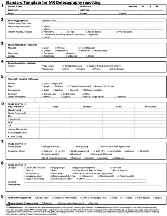 MR defecography has become the preferred imaging modality, offering an unparalleled ability to display both anatomical and functional features in detail. It is often referred to as the “All-in-One examination”. However, the diagnostic yield is sometimes not fully characterized by radiologists in their final reports, mainly due to excessive variability in the description and classification of findings, which complicates decision-making processes. The use of a structured radiology report, or template, as described in this article, could improve the characterization, management, and follow-up of patients.