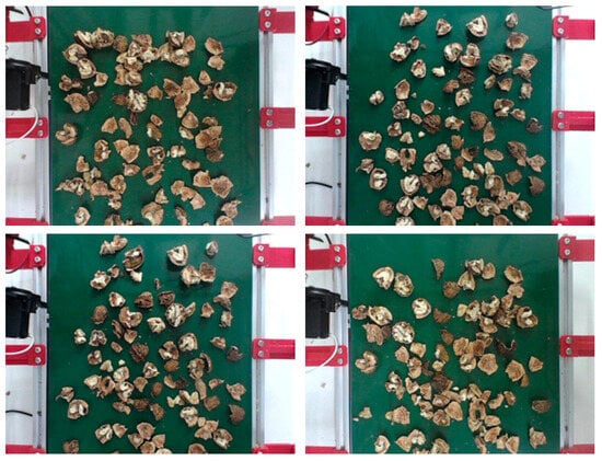 Walnuts from Lincang, Yunnan Province, China, were selected for this experiment. To simulate actual processing scenarios, we randomly broke 5 kg of walnuts into pieces, including walnut shells, walnut kernels, unseparated shell and kernel fragments, and debris. The mixtures were divided into 50 groups, with samples from each group randomly placed. All sample images were captured at a resolution of 640 × 480 pixels. Sample images from part of the dataset are shown in Figure 1.