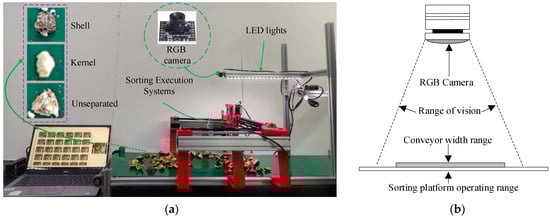 Figure 2a shows the experimental platform, which primarily consists of an optical imaging system and a sorting execution system. The system used a USB monocular camera with 90-degree distortion-free optics and a resolution of 720P to capture color images. A Raspberry Pi was used to connect the camera via USB for image capture. Figure 2b demonstrates the camera’s field of view. An LED strip was installed behind the camera to illuminate the RGB camera. The camera and LED were both mounted on an adjustable bracket. An STM32 core controller was used to automatically control the three-axis mobile sorting platform. During the experiment, the camera was mounted 34 cm above the conveyor plane. The operating range of the three-axis mobile sorting platform covered the camera’s shooting range, ensuring that all walnut material within the field of view could be sorted. The conveyor is equipped with a 42-type stepper motor and an A4988 motor driver board, which controls it to move at a speed of 0.09 m/s and stops for sorting after every 2.2 s of movement. To calculate the planar coordinates of the sorted material, a 7 × 7 tessellation grid was used for scaling, with each cell measuring 20 mm × 20 mm, corresponding to an actual pixel distance of 56 px × 56 px. The top-left corner of the image was designated as the coordinate origin, and the pixel size was converted to a distance based on the actual field of view to determine the actual location of the target.