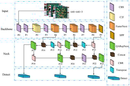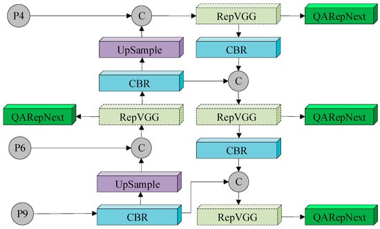 The Rep-PAN [21] architecture downsamples information in a top-down manner to convey strong semantic features and upsamples it in a bottom-up manner to enhance localization features. As shown in Figure 6, CBR [22] is first introduced at P10 and P14, while P18 and P21 are replaced with CBR. Enhanced feature extraction at P13, P17, P20, and P23 involves replacing RepVGG with QARepNext.