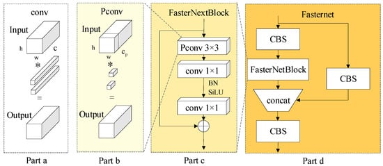 In FasterNextBlock, a simple and efficient structure known as Pconv is utilized. It reduces the computational redundancy of convolution kernels while maintaining effective feature extraction with lower FLOPs and fewer memory accesses. Fasternet employs Pconv as its primary building block. Specifically, part b of Figure 5 illustrates the construction process of Pconv, which extracts features by convolving only a subset of the input channels while leaving other channels unaffected. For continuous or regular memory accesses, the first or last channel is computed as a representative of the overall feature mAP, resulting in an equal number of input and output channels.