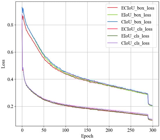 The improved YOLOv8s model presented in this paper utilizes ECIoU loss, and comparison experiments were conducted with the YOLOv8s network using CIoU and EIoU as loss functions. The comparison results are shown in Figure 7, which depicts the curves of CIoU_Loss, EIoU_Loss, and ECIoU_Loss for localization loss (box_loss) and classification loss (cls_loss) throughout the training process. The model was trained for 300 epochs, with CIoU_Loss, EIoU_Loss, and ECIoU_Loss taking 3.7 h, 4.10 h, and 3.90 h, respectively. The box_loss decreased to 0.206, 0.203, and 0.205, while the cls_loss decreased to 0.105, 0.09, and 0.098, respectively.