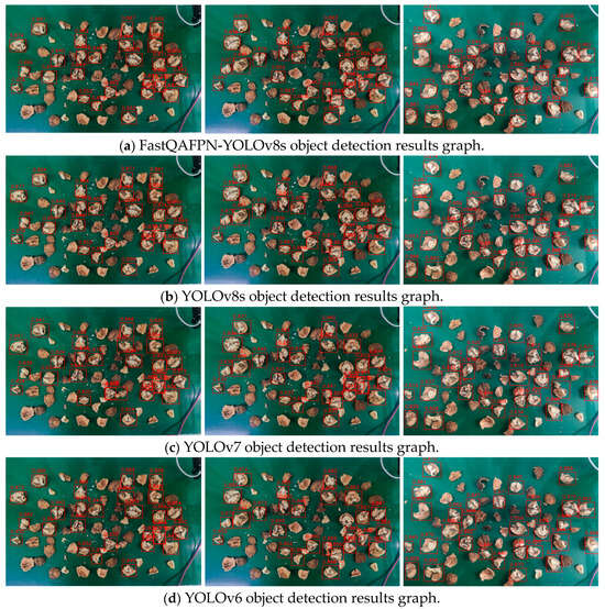 In summary, FastQAFPN-YOLOv8s has the smallest model size, the highest frame rate, and higher average confidence than both YOLOv6 and YOLOv7, with only a 0.4% difference from YOLOv8s. The mAP is greater than that of YOLOv6, and the differences with YOLOv7 and YOLOv8s are just 0.3% and 0.9%, respectively. Although the accuracy of FastQAFPN-YOLOv8s is similar to that of the other versions, it stands out as the most lightweight and fastest model, making it the most suitable choice for walnut material sorting devices.