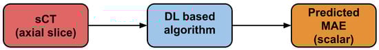 Representation of the general MAE prediction pipeline. An axial sCT slice is given as input, and the associated MAE scalar for the image slice is predicted by using a DL pipeline.