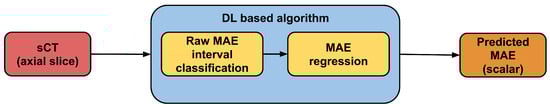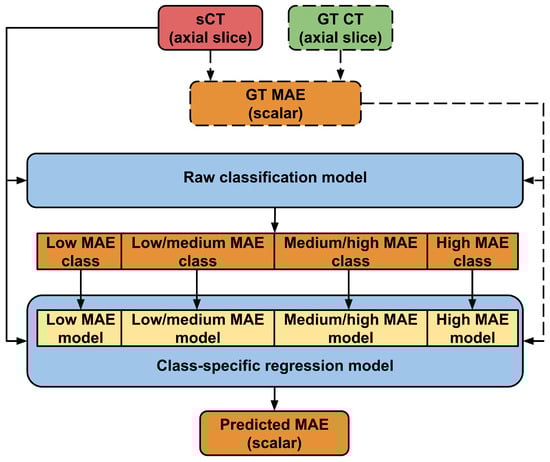 Detailed workflow of MAE prediction. A single sCT axial slice is fed firstly into a DL model that classifies it as belonging to a specific MAE class. According to this prediction, the 2D image is then provided as input to a connected DL regression model, specifically trained to operate on a restricted range of MAE values. As a result, the MAE of a single sCT slice can be forecasted. In order to train the different models with a GT MAE, the ground truth CT is needed (dashed lines are needed only to train the models).