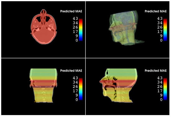 The output of a single prediction is a scalar value representing the estimated MAE for the entire given axial slice. In envisioning a clinical use, it is fundamental to visualize the predicted conversion error slice-by-slice and overlaid on the sCT. To achieve this, a volume (named “Predicted MAE volume”, ), having the same shape as the corresponding sCT, is generated. During the sCT evaluation step, the predicted MAE of the i-th axial slice is assigned to the i-th axial slice of , which will be visualized by taking advantage of a dedicated color map. Figure 3 shows an example of an sCT overlaid to its .