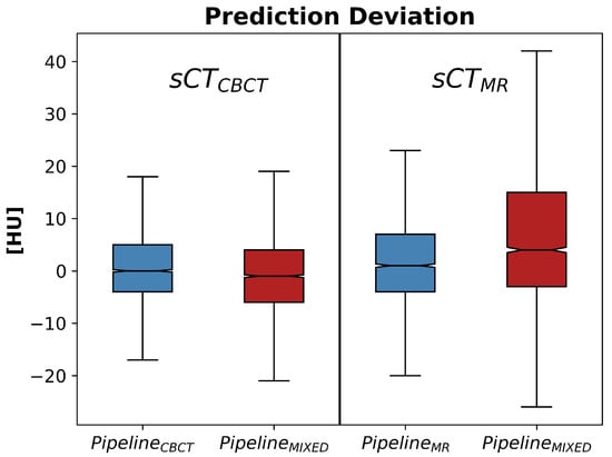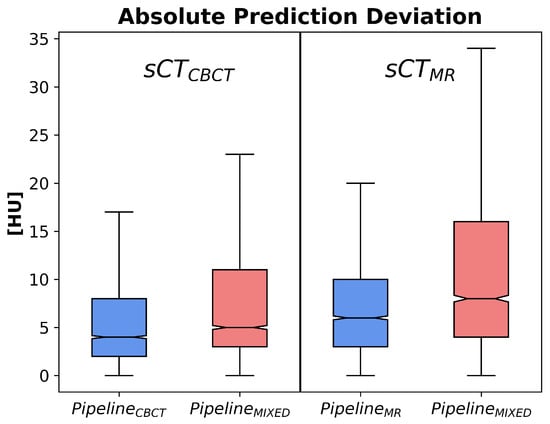 Tables containing the median, the 5th, the 25th, the 75th, and the 95th percentiles of both PD and APD are reported in Appendix A. To assess whether a statistical difference exists between the predictions obtained by using the mixed-trained workflow () versus the specific modality pipeline ( and ), the Wilcoxon rank-sum test is run over all the pairs of MAE predictions obtained for all the patients fed into the different pipelines. These tests reveal that both single-modality options performed significantly better than the mixed solution (p-values < 0.01). Figure 3 shows an example of the overlay of the sCT and its . As can be seen, for slices depicting small and movable anatomical structures (e.g., nasal cavities), higher MAE values are predicted. This behavior was expected and desirable, confirming the effectiveness of the proposed strategy.