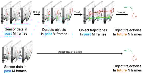 - Peri, N.; Luiten, J.; Li, M.; Ošep, A.; Leal-Taixé, L.; Ramanan, D. Forecasting from lidar via future object detection. In Proceedings of the IEEE/CVF Conference on Computer Vision and Pattern Recognition, New Orleans, LA, USA, 18–24 June 2022; pp. 17202–17211. [Google Scholar]