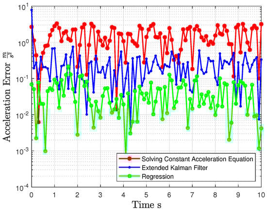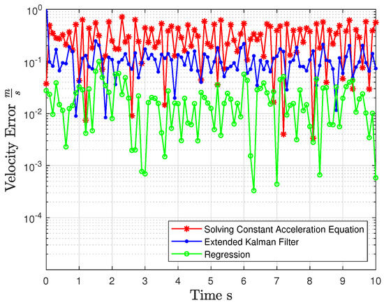 - The Extended Kalman Filter (EKF) assumes that the noise follows a Gaussian distribution [36], as its estimation framework is optimized for such conditions. In contrast, the Second-Order Regression (SOR) method is not limited by specific noise distribution assumptions. This flexibility makes SOR more robust and effective in scenarios where the noise is non-Gaussian or has an unknown distribution, which is common in real-world applications.