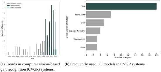 Gait data can be gathered using various wearable sensors, including accelerometers, gyroscopes, and goniometers []. In contrast, CVGR systems primarily rely on 2D or 3D imaging sensors to capture gait data from long distances, even without the subject’s active participation []. CVGR systems offer several advantages: they are non-invasive, are robust to impersonation, function well over long distances, do not need high-quality cameras, and can be combined with other sensing modalities []. Additionally, as shown in Figure 1a, recent years have witnessed a shift in gait pattern recognition, moving away from traditional approaches towards modern techniques based on deep learning (DL). Not only does this enable higher accuracy in gait identification, but it also allows the deployment of CVGR in more challenging and varied environments.