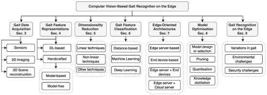 The structure of this survey is illustrated in Figure 2. Firstly, Section 2 presents a summary of the review process and inclusion/exclusion criteria. Then, Section 3 details common sensors and methods for acquiring gait data. Following this, Section 4 explores various techniques for representing and processing gait features in CVGR systems. We then delve into different dimensionality reduction techniques aimed at achieving computational efficiency. Section 6 provides a detailed overview of both traditional and modern models for gait feature classification. Next, Section 7 examines various edge computing architectures, while Section 8 presents techniques to accelerate machine learning inference. The convergence of gait recognition and edge computing is discussed in Section 9. Finally, the paper concludes by discussing and summarising our findings in Section 10 and Section 11.