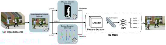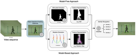 In contrast to DL, handcrafted features are manually designed based on researchers’ domain expertise and understanding of distinctive gait characteristics. These features capture the unique structure, motion, and dynamics of an individual’s walking pattern. Handcrafted features can be categorised into two groups: model-based and model-free. Model-based approaches focus on extracting skeletal information and joint positions to capture the localised movement patterns of each body part []. Conversely, model-free methods (also known as appearance-based methods) directly extract features (primarily silhouettes) from a sequence of gait cycles []. Table 2 compares handcrafted-based and DL-based feature representations. Additionally, Figure 4 illustrates a common CVGR system, including two potential modalities for feature extraction: model-based and model-free. The following sections will provide a more detailed exploration of these modalities.