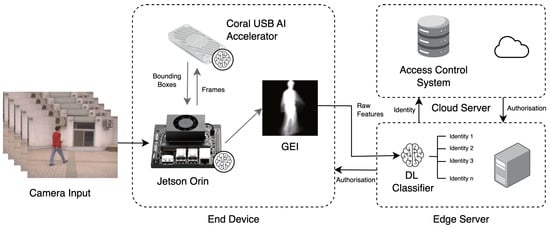 In an era marked by the proliferation of smart devices and video surveillance systems, biometrics has emerged as a crucial field for secure and convenient identity verification. Among various biometric modalities, computer vision-based gait recognition (CVGR), which analyses an individual’s unique walking pattern, provides a non-invasive and potentially unobtrusive identification method []. However, traditional CVGR systems, often reliant on centralised cloud-based architectures, face challenges in terms of latency, bandwidth consumption, and privacy concerns. The emergence of edge computing, which brings computation and data storage closer to the source, presents a compelling paradigm shift. CVGR systems deployed on the edge unlock diverse opportunities, from reducing latency in biometric authentication to enabling real-time fall detection and rehabilitation monitoring and even opening new avenues for human–computer interaction.