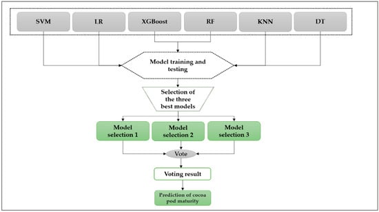 The classifier voting algorithm is very efficient. It allows voting on the predictions of a set of classifiers. The algorithm capitalizes on weaknesses in one algorithm that may be an advantage for another classifier. Voting combines the predictions from the classifiers into a final prediction output [27,28]. In our study, we will recover the three best classifiers for each experiment, which will be used for voting.