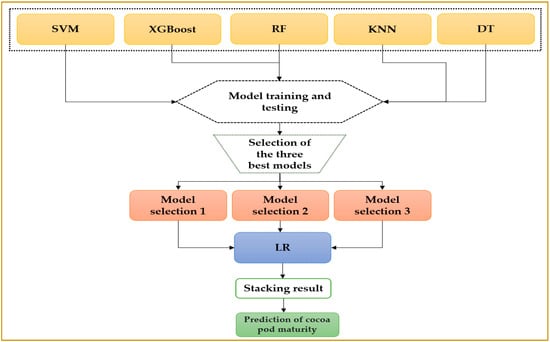 Stacking is a machine learning method that uses meta-learning to integrate multiple algorithms. The method is carried out in two stages. The first stage uses several algorithms to collect their output; the meta-learner merges into another learning algorithm’s stacking structure. In our study, the meta-learner will be the logistic regression algorithm, and the stadium algorithms will be the three best algorithms [29]. Figure 2 illustrates the stacking method used in our study.