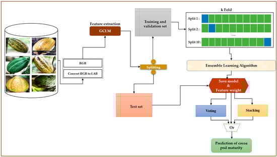 The detection of the maturity of agricultural products, particularly that of cocoa pods, has attracted growing interest in image processing research, mainly through color analysis and ensemble learning. These methods provide accurate crop condition assessment, supporting practical applications in agriculture, such as harvest optimization. Several works have been carried out in this area, particularly in the context of research. For example, Lockman et al., in their study, investigated the effectiveness of laser-induced backscatter imaging (LLBI) for determining the firmness and color of cocoa pods at different stages of maturity. Classification of samples according to their maturity resulted in 90% of samples being correctly classified into an unripe group using a laser diode at 658 nm and 95% at 705 nm [7]; Gao et al. proposed a model using ensemble approaches (boosting and bagging) with feature extraction algorithms (LDA and PCA) to predict heart diseases. The experiment results indicated that the bagging ensemble learning method with decision tree feature extraction and PCA performed best [8]. Bueno et al. studied a technique to determine the degree of ripeness of cocoa based on the acoustic sound of cocoa pods. Their approach made it possible to extract recognizable features for the training process and then apply a convolutional neural network to classify the cocoa sound. The experimental model gave an accuracy of 97.46% of the classification system on the maturity of unripe and ripe pods [9]; Galindo et al. investigated an innovative method to determine the maturity of cocoa pods using acoustic sensing technology. Their approach aims to replace the traditional method of hand tapping to identify ripe pods, which relies on the hollow sound produced by less compact beans. A device generates recorded acoustic signals for analysis, and a cepstrum-based technique was used for feature extraction. By applying a model based on the SVM algorithm and using nested cross-validation, they achieved an average test score of 94%, demonstrating the effectiveness of this method in improving harvesting accuracy [10]. Sunday Samuel et al. proposed an ensemble machine learning algorithm, SA-CCT, to accurately predict black rot disease in cocoa trees in southwest Nigeria. By exploiting climate parameters (rainfall and temperature) from the Nigerian Meteorological Agency (NIMET), the model combines a linear algorithm (SARIMA) and a non-linear algorithm (CCT). Evaluation of the model, implemented in Python, yielded high performance, with a precision of 94.29%, a recall of 91.67%, a root mean square error of 0.2357, and an overall accuracy of 94.44%. These results demonstrate the potential of the model to support farmers and extension agents in combating this disease [11]; Ayubi et al. proposed an innovative approach to identify cocoa fruit maturity by combining YOLOv5s with the convolutional block attention module (CBAM). This method was tested on the Cocoa Maturity Dataset TCS 01 and a PT dataset (Cargill, Indonesia). The integration of CBAM aims to improve the feature representation, thereby increasing the detection accuracy. The results show that this approach achieves high accuracy while maintaining a compact model size, making it suitable for practical applications. This method could help improve the productivity of cocoa cultivation [12]. De Oliveira et al. used one approach by studying a deep network-based classification model built on the Inception-Resnetv2 model to identify cocoa pods in their environment and differentiate between ripe cocoa pods before harvest. The results obtained from their study gave an accuracy of 90% [13].