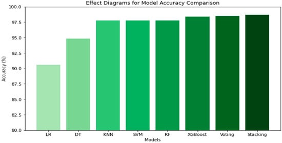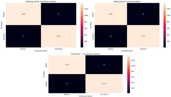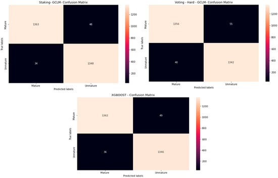 Figure 5 presents the confusion matrix of the best-performing algorithms: the stacking and voting ensemble methods and XGBoost, which were selected for their high performance.