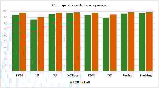 The performance analysis of the algorithms reveals that the LAB color space consistently yields higher accuracies than the RGB space across all evaluated algorithms. The SVM algorithm achieves an accuracy of 97.78% in the LAB space compared to 94.09% in the RGB space, while the stacking algorithm attains 98.71% in LAB versus 97.06% in RGB. These findings suggest that the LAB color space, with its superior ability to distinguish color nuances, enhances classification precision and boosts algorithm performance in this context. This trend is clearly illustrated in the histogram presented in Figure 8, which summarizes the results for all algorithms.