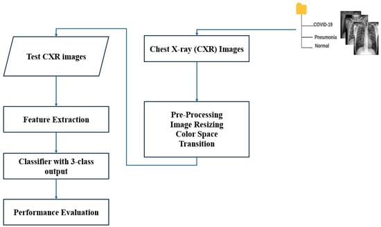 The main blocks of the algorithm ML-based CXR-DNN developed here are presented in Figure 1. This figure illustrates the CXR-DNN model’s comprehensive architecture and methodology, which entails the processing of chest X-ray images through a series of phases for the purpose of screening and classifying COVID-19, viral pneumonia, and normal cases. The diagram highlights critical components, such as data input, preprocessing, feature extraction, and final classification. The main objective is to diagnose the illness from a CXR image. Specifically, a CXR-DNN is based on an analysis of CXR images by employing a DNN.