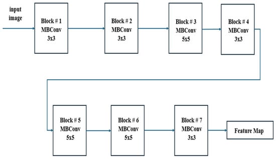 Convolution is utilized by our proposed technique. The first component, i.e., stem block, is an attention mechanism module that processes an attention mechanism in parallel multiple times. The second component is a series of MBConv blocks that facilitate efficient feature extraction, reduced computational complexity, and enhanced representational power through depth-wise separable convolutions, squeeze-and-excitation blocks, and residual connections. The third component is compound scaling [28], which facilitates balanced model scaling by simultaneously adjusting depth, width, and resolution, leading to improved performance, optimal resource utilization, and enhanced model generalization. The next step is to determine suitable values with the help of advanced features. The accuracy is calculated according to many different performance indicators (see Figure 1).