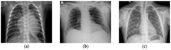 CXR images of lungs in patients: (a) healthy, (b) COVID-19, and (c) pneumonia.