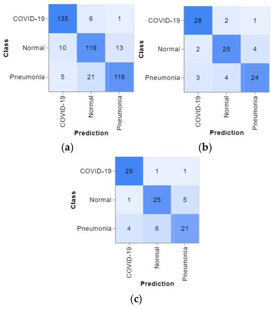 3 × 3 confusion matrices for the (a) Training, (b) Validation, and (c) Testing datasets representing the model’s performance in true positives, false positives, true negatives, and false negatives for each class (COVID-19, Normal, and Pneumonia).