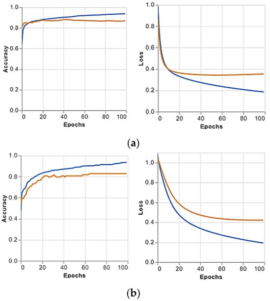 Accuracy and loss per epoch for each dataset, illustrating the model’s performance and learning progression: (a) Training dataset, (b) Validation dataset, (c) Testing dataset. In the accuracy graphs, the blue curve represents accuracy, and the orange curve represents loss. In the loss graphs, the blue curve represents loss, and the orange curve represents accuracy, showing their variation over the epochs.