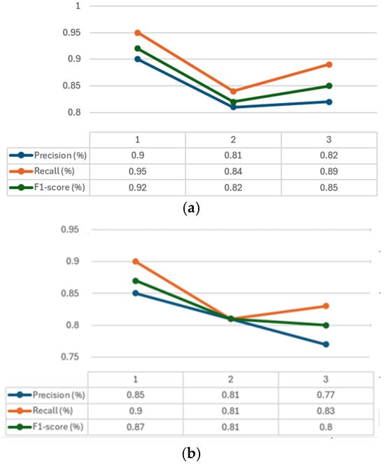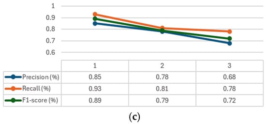 The convergence graphs of precision, recall, and F1-score are presented in Figure 6 for every class considered (1–3). It can be seen how, in all the graphs (Figure 6a–c) CXR-DNNs assess a good class’s prediction accuracy. The best accuracy score (p = 95%) using our proposed model CXR-DNN is shown in Table 7. These results imply that the network may benefit from transfer learning to extract useful characteristics in terms of COVID-19 illness diagnosis. More than one piece of work has used this concept to speed up the creation of a trustworthy instrument to aid medical professionals in the diagnosis of COVID-19.