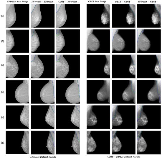 Figure 1. Examples of the performance of the proposed method for the same- and cross-dataset tests for INbreast and CBIS-DDSM datasets. Each row from (af) presents two examples from INbreast and CBIS-DDSM datasets. The green and blue colors present boundaries for the ground truth and predicted segmentation.