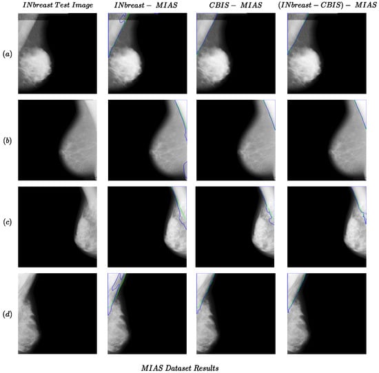 Figure 2. Examples of the performance of the proposed method for cross-dataset tests for the MIAS dataset as the test set. Each row (ad) presents results for one sample in the MIAS dataset. The green and blue colors present boundaries for the ground truth and predicted segmentation.