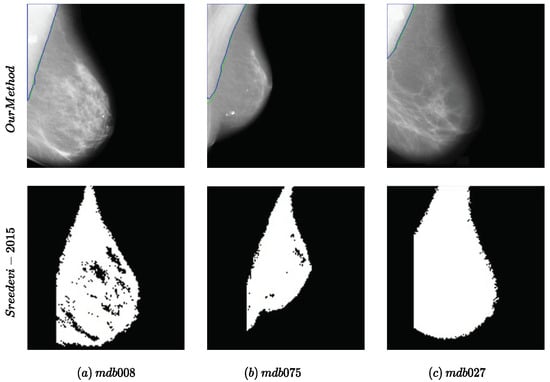 Regarding the visual comparison, as neither the implementation nor the full results on the datasets were available, we compared our method with one of the previous works that included visual results with the image ID [7] for the MIAS dataset. The results are presented in Figure 3. Our method achieved better results in comparison with [7] with smoother edges without any further postprocessing.