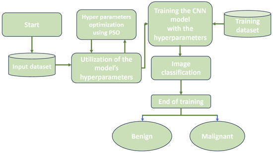 16] developed a classification system for mammogram images called CNN improvement for breast cancer classification (CNNI-BCC). The CNNI-BCC model classifies the images of breasts into three classes: malignant, benign, and normal masses. They had an accuracy rate of 90.50% and a specificity of 90.71%. Although evolutionary algorithms have been employed to optimize CNN parameter values, their use has not received much research. Today, in research, metaheuristic algorithms are employed for designing deep learning architecture. For example, the authors in [