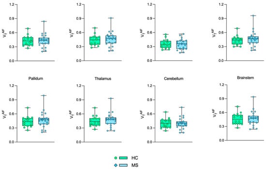 Table 2 shows the VT mean, standard deviation, and p-values using the AIF (VTAIF) and IDIF (VTIDIF) for the HC and MS groups. For almost all brain regions, slightly higher VTAIF and VTIDIF values were observed in the MS cohort when compared to the HC group; however, the statistical analysis (GLM) showed that there are no significant differences in (R)-[11C]PK11195-VT values between the groups. Additional Student’s t-tests were performed without age and sex corrections for VTAIF and VTIDIF, as no statistical difference was found.