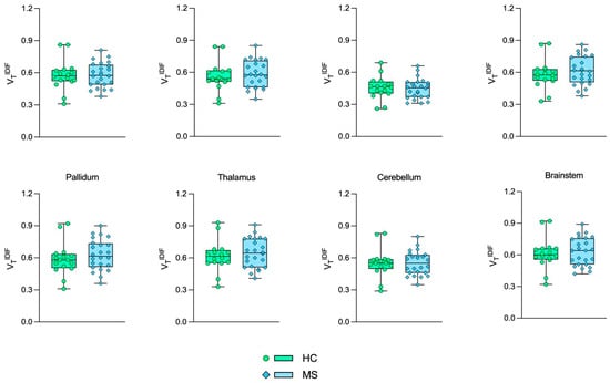Figure 1 and Figure 2 show the boxplot representation of VTAIF and VTIDIF parameters in MS and HC groups, respectively. Despite the higher deviation from the mean for VTIDIF in the HC group and the overall VT overestimation by IDIF in comparison to AIF, the VT distribution was very similar among the groups.