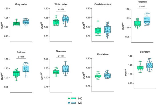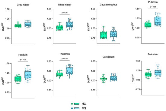 Boxplot representation of DVRIDIF. Green boxes with circles represent the DVRIDIF values in the HC group, and blue boxes with diamonds represent the DVRIDIF values in the MS group. The p-values from GLM tests are shown, respectively. HC: Healthy control. MS: Multiple sclerosis.