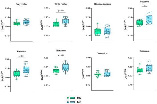 Boxplot representation of DVRSVCA4. Green boxes with circles represent the DVRSVCA4 values in the HC group, and blue boxes with diamonds represent the DVRSVCA4 values in the MS group. The p-values from GLM tests are shown, respectively. HC: Healthy control. MS: Multiple sclerosis.