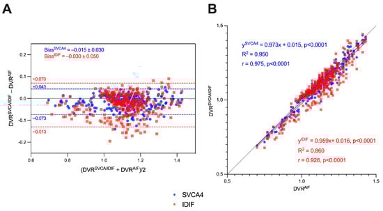 Bland–Altman (A) and linear regression analysis (B) of DVRAIF, DVRIDIF, and DVRSVCA4 (IDIF in red and SVCA4 in blue).