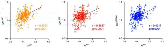 The results of the correlation analysis of VT and DVR parameters are shown in Figure 8. A moderate correlation between DVR and VTAIF was found for DVRAIF (0.4394, p < 0.0001) and DVRSVCA4 (0.4217, p < 0.0001), while a weak correlation was found for DVRIDIF (0.3887, p < 0.0001).
