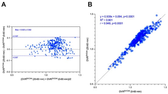 Figure 9 shows the Bland–Altman (9A) and linear regression (9B) analysis between the DVRSVCA4 values quantified using the full image (0–60 min) and the reduced image (20–60 min). It is noted that both methods provided very similar results, with a bias equal to 0.025 ± 0.042 and the parameters from the linear regression, R2, slope, and intercept equal to 0.901, 0.939 (p < 0.0001), and 0.015. Finally, a strong correlation was found between the two variables (0.975, p < 0.0001).