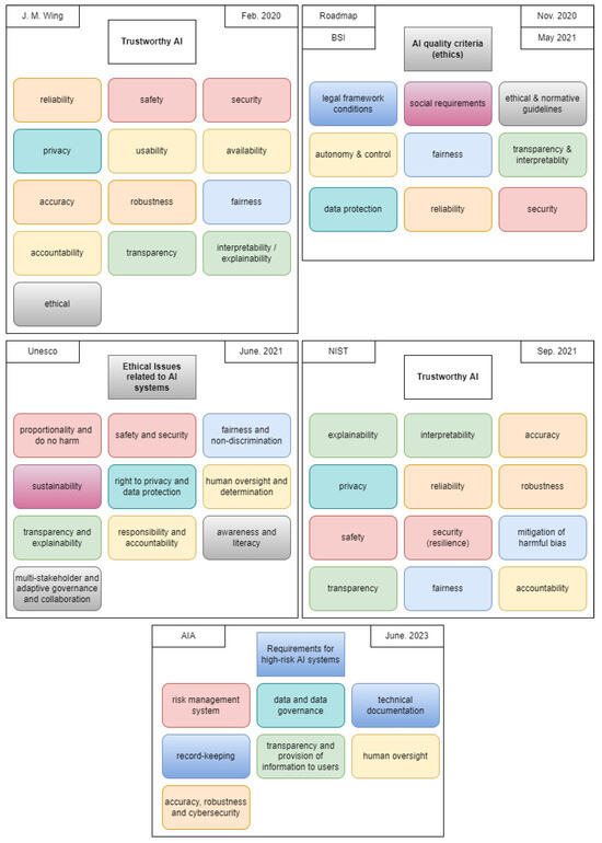 In addition, various documents regarding the usage of AI systems have been proposed in recent years. Different documents use different terminology for specific aims i.e., “Trustworthy AI” [14,15,16], “Responsible AI” [17] or “Auditable AI” [18,19]. The BSI also provides a guideline for the auditing of AI systems [19]. With regards to individual requirements of AI they refer to AI quality criteria defined by the German Institute for Standardisation Registered Association (DIN) in [18]. In their own words, they focus on the ethical aspects of AI usage and define a total of nine criteria. Among other things, the role of humans in the process (both users and affected parties) and external influences such as the General Data Protection Regulation (GDPR) [20] are discussed. Another recommendation for the usage of AI comes from the United Nations Educational, Scientific and Cultural Organization (UNESCO). It also focuses on the ethical aspects and places particular emphasis on the human being in and around the process. The unique aspects of this document are public awareness of AI, sustainability of AI application, and broad definitions of transparency and explainability. In “Four Principles of Explainable Artificial Intelligence” by the National Institute of Standards and Technologies (NIST) [16], two aspects are addressed: requirements for trustworthy AI systems with a focus on explainable AI, and four principles of explainable AI. The latter is more relevant and will be discussed in more detail in the following Section 2.3. The last and most recent document addressing responsible AI originates from Interpol [17]. It also contains the most important requirements of the documents discussed. A overview of the individual requirements will be described in Section 3.2.