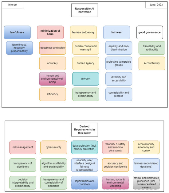 To further validate the suitability of the derived requirements, a projection is performed with regard to existing documents addressing the usage of AI systems, as discussed in Section 2.2. However, it has to be noted that the different documents have different terminology for the same definition, which reinforces the need for uniform terminology. In Figure 1 and Figure 2, the requirements of existing literature are shown and colored to highlight matching scopes and definitions. In contrast to the existing documents, we diversified the aspect of explainability to differentiate between the algorithm and its decisions as well as different recipients of the explanation, which are most commonly used ambiguously. A further illustration of the comparison can be found in Table 2. The first column of the mapping relates to the AIA, as this is the focus of the work. The order afterwards corresponds to the date of publication of the document, starting with the oldest on the left-hand side. In particular, it should be noted that the area of requirements is constantly evolving, as only some specific aspects were dealt with in the first documents. In addition, the requirements are categorized according to their scope of application, resulting in a total of five categories, as shown in the first column of Table 2. The first category, IT Systems and Protocols and Compliance, summarizes all aspects of the IT system and is not tied solely to AI systems. It addresses, among other things, the principles of the forensic process (i.e., the chain of custody and logging, as described in [5]). Algorithms and their training refers to the steps of algorithm and model development before they are applied. For more details on model development (i.e., forensic modeling work as well as benchmarking and certification), the reader is referred to [5,21,35]. UI Usability concerns the general application of the IT system’s user interface. The fourth category of Decisions refers to the application of the system in individual cases (e.g., DeepFake detection in remote identity proofing [13]). In this example, a distinction is made between the human operator of the AI system and the one affected by the decision. The last category consists of Legal Framework Conditions; Human, Social and Environmental Well-being; Ethical and Normative Guidelines (incl. Human-centered Values); and External Influences. As they are highly dependent on national legislation and norms, they are not considered in detail in this paper.