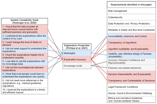 A further connection can be made by the explanation properties provided in [16], as the aspects ”Meaningful”, “Explanation Accuracy”, and “Knowledge Limits” can be projected onto the existing questions of the SCS [23] as well as the requirements identified in this paper. An illustration of this connection can be found in Figure 3. However, these properties can only be considered in conjunction with a specific explanation.