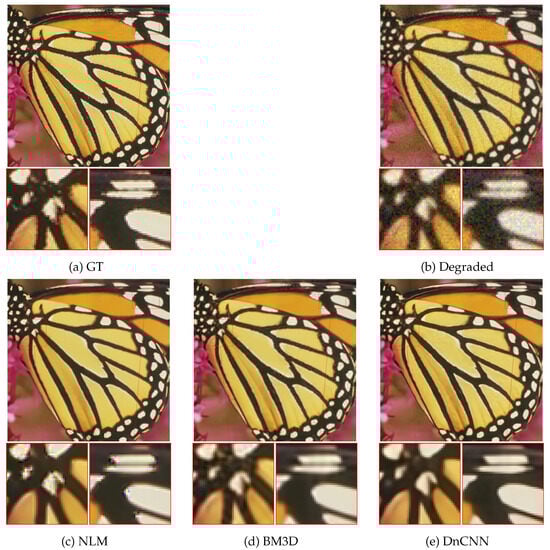 In this section, the focus is on images belonging to the Set5 dataset. We simulate blurred and noisy data by employing the linear image formation model defined in Equation (1) with parameters set to (, ). Through this setup, we aim to assess how each of the aforementioned denoising methods impacts the quality of the restored images with respect to PSNR and SSIM metrics and visual quality.