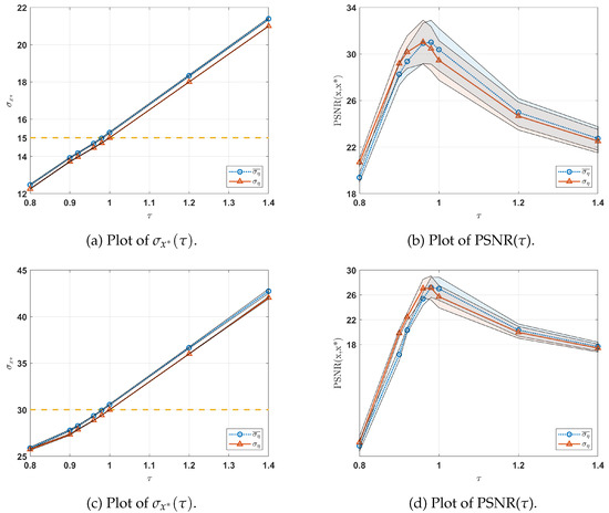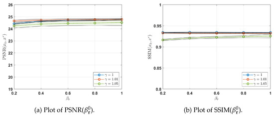 Figure 3b,d illustrate the behavior of the PSNR metric with respect to . Notably, comparable performance in terms of PSNR is observed for both scenarios. Additionally, Figure 3b,d emphasizes that the highest PSNR is achieved when setting .