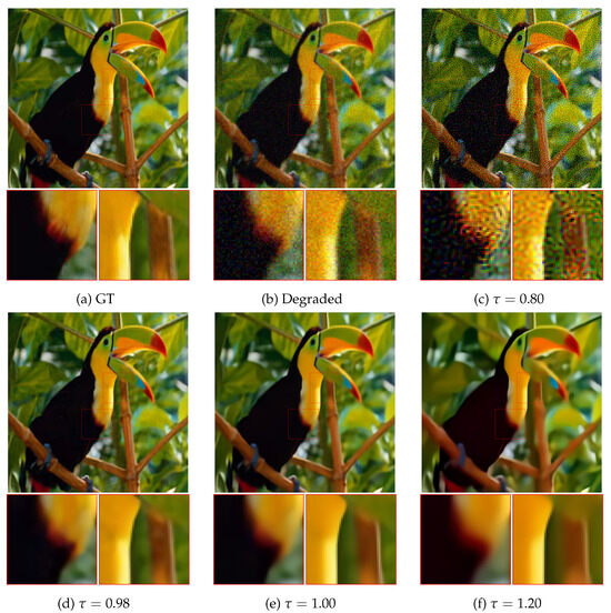 In Figure 3a,c, the idealized scenario (blue lines) demonstrates that the computed closely aligns with when across all images in Set5 (thin shading). In contrast, within the realistic scenario, where only an estimate of the Gaussian noise level is provided, the optimal approximation of is achieved at for both degradation levels. Multiple experiments have consistently revealed that this phenomenon stems from the algorithm in [43], which tends to overestimate the noise level in the simulated data .