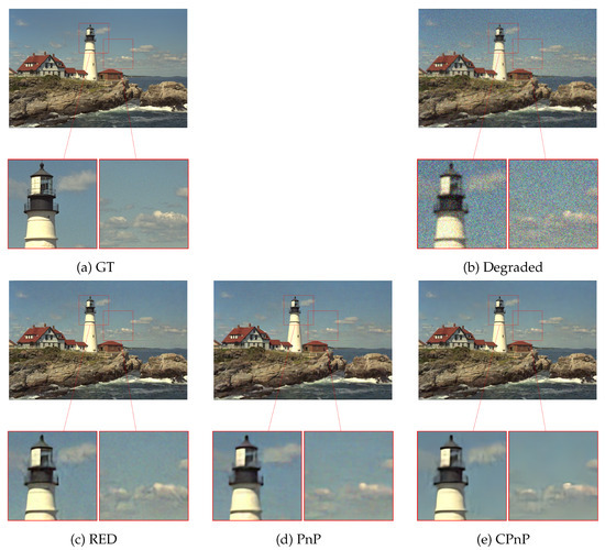 Under the framework presented in [31], Step 3 of Algorithm 1 is considered as a reconstruction step and provides the maximum a priori estimate given the data and the operator . Step 4 is the denoising operator: this depends obviously on the design choice in (2), namely, in the choice for . The strategy depicted in [31] instead suggests bypassing this designing and directly employing a denoising operator D in Step 3.