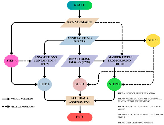 Our work focuses on three different approaches to the evaluation of MS image registration. The first method is based on the registration of individual spectral channels to a reference spectral channel using SIFT and random sample consensus (RANSAC) [31], at a time, and utilizes the homography matrix, derived during registration for the realignment of all the annotations performed across respective spectral channels. This means that spatial readjustment is performed on the coordinates of the annotations across the four spectral channels using the homography matrices obtained during the registration of every spectral band. The second method is based on segmentation-based registration [32] of binary mask images obtained from the annotated ground truth, which are registered using SIFT and RANSAC. In this method, every binary mask image corresponding to a spectral channel was registered to the binary mask image of the reference spectral channel. The third method is based on the mask-based registration of the pixels of interest derived from the annotated ground truth. In this method, only the masked pixels are registered using SIFT and RANSAC.