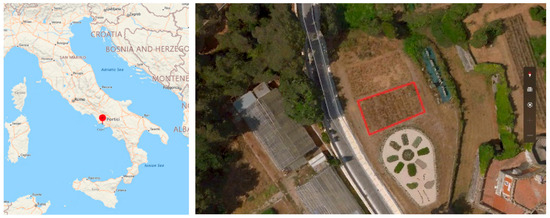 Locational information of the bread wheat farm in Department of Agronomy, University of Napoli Federico II (study area marked in red polygon). Source: Imagery @2020 Airbus, Maxar Technologies, Google Earth.